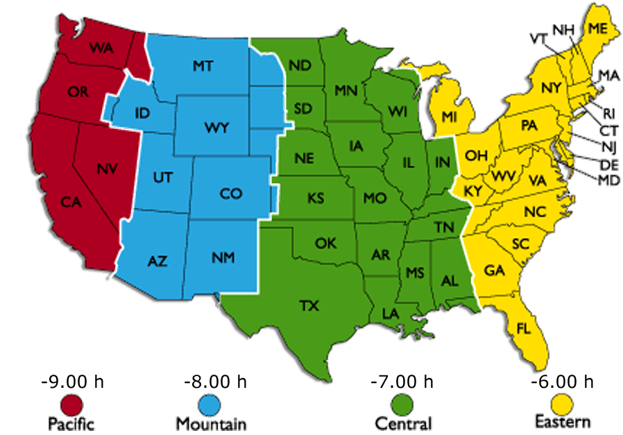 Per gli orari vengono utilizzate le cifre da 1 a 12 associate alle abbreviazioni a.m. (ante meridiem) e p.m. (post meridiem) per indicare rispettivamente mattina e pomeriggio. L'ora legale comincia normalmente il 25 aprile e termina il 31 ottobre.